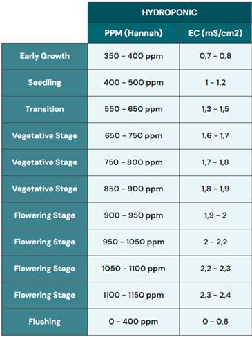 - EC (Electrical Conductivity): Mit EC misst man die elektrische Leitfähigkeit des Wassers, wodurch ebenfalls die Menge der vorhandenen Nährstoffe bestimmt werden kann.