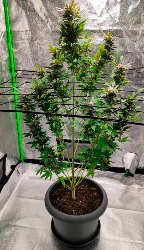 Currently, the EC values are also much more stable than during the vegetative phase. I did a complete water change again (because the plant was fixed in the scrog net, I pumped all the water out of the container and filled in fresh tap water at the top without having to move the plant). I continue to top up the water daily and add CANNA booster for strong flower growth. Aqua has now expanded across the entire available width of the grow tent, partly due to the branches being pulled apart through the scrog net. The flowers are clearly growing, and fine pollen dust can already be seen on some of them.