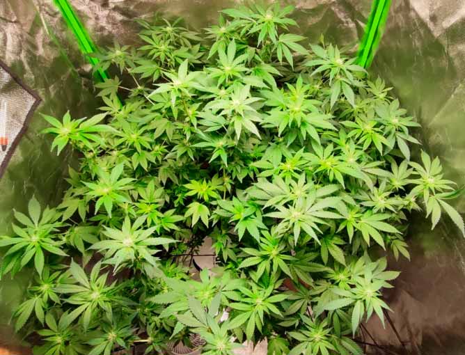 This week I have removed a lot of leaves that have spread out in the centre part of Aqua and prevent the light from shining further into the deeper regions than the canopy. The focus is clearly on clearing the individual strands of fan leaves and leaving only the ‘sugar leaves’ on, which, unlike fan leaves, have relatively high cannabinoid and terpene levels – so whatever you do, don’t throw them away! According to internet sources, the reason cannabis plants produce trichomes and cannabinoids is not to get us high, but to protect themselves from a variety of dangers such as predators and UV exposure. The trichome-covered leaves between the flowers are simply another protective measure.