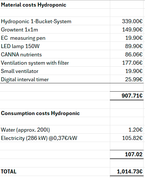 After drying for 18 days, the total yield of Aqua weighed exactly 180g. Not bad for a first try, but surely this can be increased with certain measures. If I use the costs listed below for the first harvest, I arrive at €5.64/g. However, for the next harvest I would only have the water, electricity and nutrient costs, i.e. the next harvest would be much cheaper.