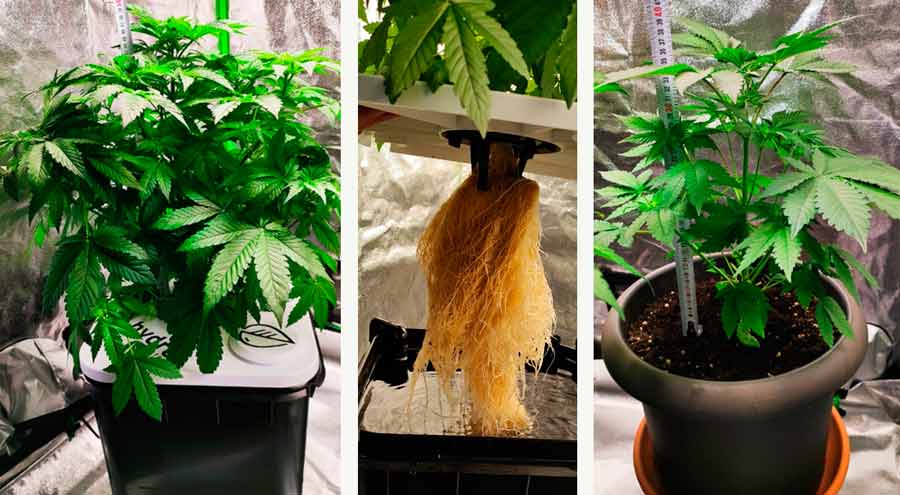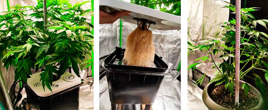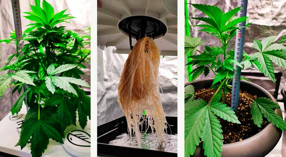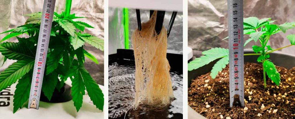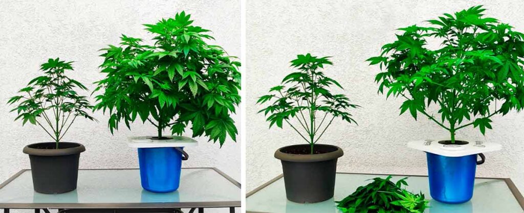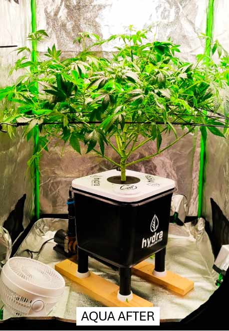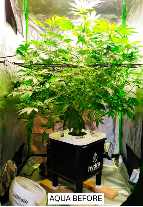 Both plants are now growing faster, probably because the roots are getting bigger and bigger. With Aqua, I have to add water every 2-3 days as the plant absorbs more water and it condenses over the leaves (at least that’s my perception). I have cut off more larger fan leaves, which take the light away from the many smaller leaves below. In comparison, I have noticed that Aqua develops significantly more side shoots and stems, which leads to a more lush volume and ultimately to a higher yield when the flowers develop in a few weeks.