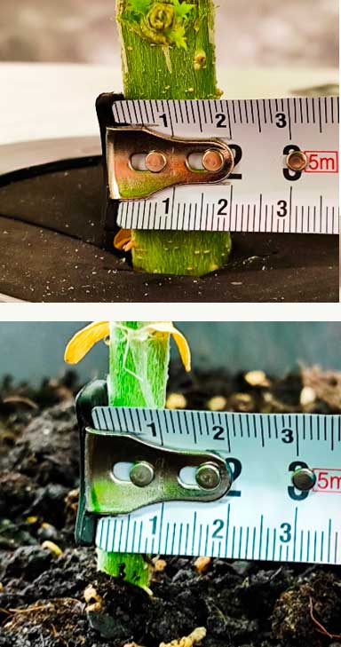 I will continue lollipopping in small steps over the next few days, as this should be done before the flowering phase and the change in light from 18 to 12 hours. I now have to top up the water and nutrients almost every day. The LED brightness also needs to be gradually raised due to the growth. In comparison, Terra looks ‘puny’ and I took her out of the tent especially for the photo so that you can see something of her at all. The stem diameter at the bottom is 0.9 cm for Terra and twice as much for Aqua (1.8 cm).