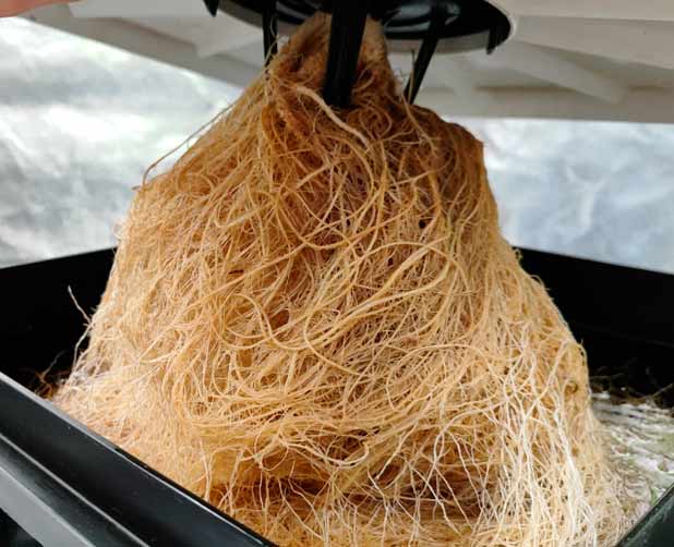 As I want to bring the water temperature down, I left the grow tent and the garage door open a little at night this week so that the warm air can escape better. And I have actually been able to keep the water temperature between 21 and 23 degrees on average this week. I also cut off 4 large fan leaves that were preventing the light from above to illuminate the lower part of the plant. The roots have already grown to an astonishing size in this short time.